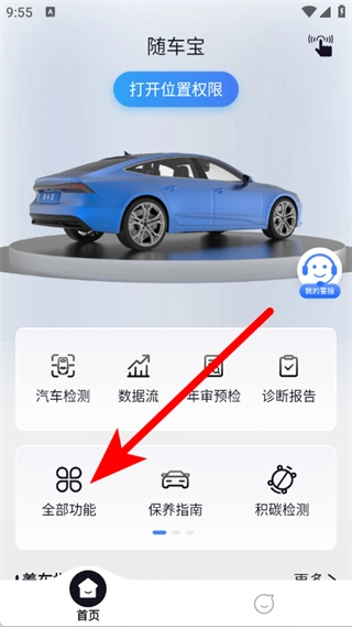 打开随车宝汽车检测仪,找到并点击“全部功能”选项,即可进入全部功能页面。