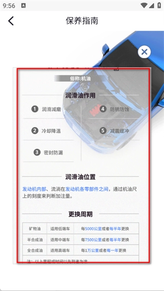 在详情页面里,去查看保养指南中有关发动机润滑油的作用、所在位置以及更换周期等具体信息。