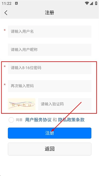 输入密码后再次确认,填写验证码,点击注册按钮,即可完成账号注册流程。