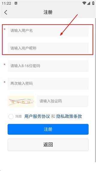 在注册界面填写用户名与用户昵称后,即可进入下一步操作。