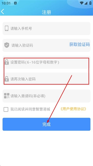 设置密码后再次输入确认,点击完成按钮,即可完成账号注册流程。
