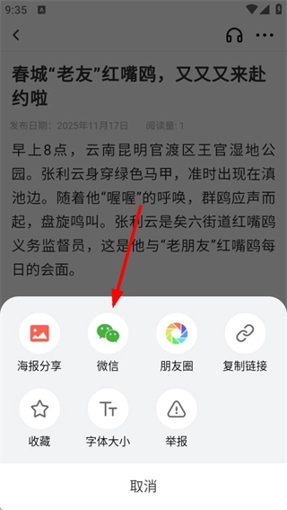 在弹出的菜单里,点击微信选项,就能把这篇文章分享到微信了。