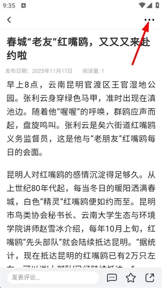 在文章详情页,点击右上角的更多图标,会弹出功能选项菜单。