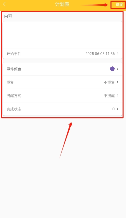 接下来输入行程安排、具体事件等相关信息,填写完成后点击页面右上角的确认按钮即可。