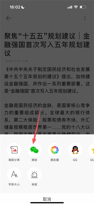 当弹出操作菜单后,点击微信选项,就能把这条新闻分享到微信平台了。