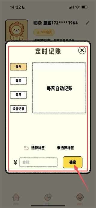 在定时记账页面,选定周期并填写相关信息后,点击确定按钮即可完成定时记账的设置。