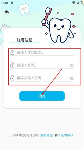 在账号注册界面,依次填写账号、密码以及确认密码,随后点击确定按钮,即可完成注册流程。