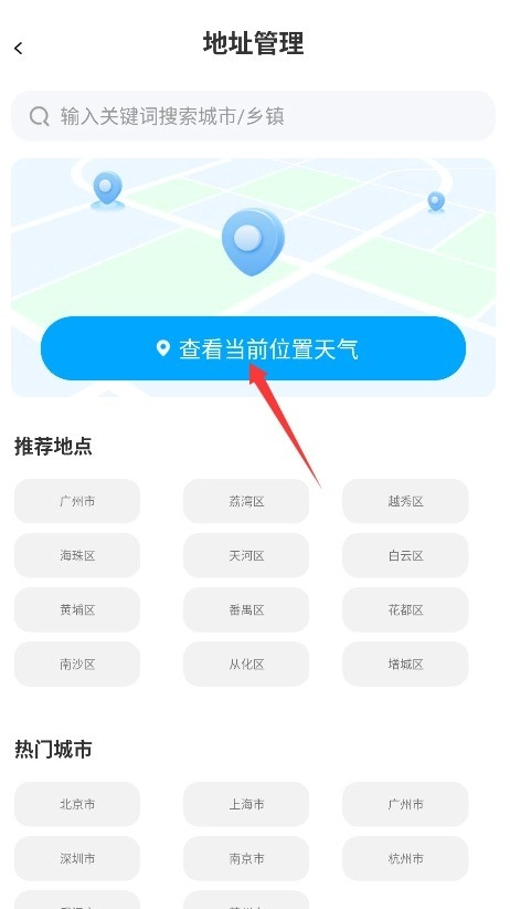 2、可开启手机定位功能以自动获取当地天气,也能在管理页面手动输入想要查询的城市名称。