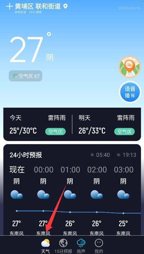 3、进入天气首页后,可查看实时气象数据;点击语音播报按钮,就能收听最新天气情况的语音版本。