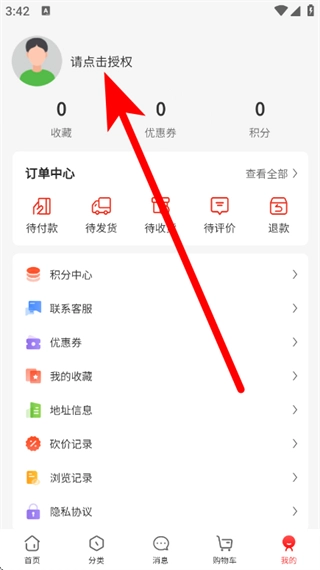在西西礼页面,点击底部我的选项,进入个人页面。