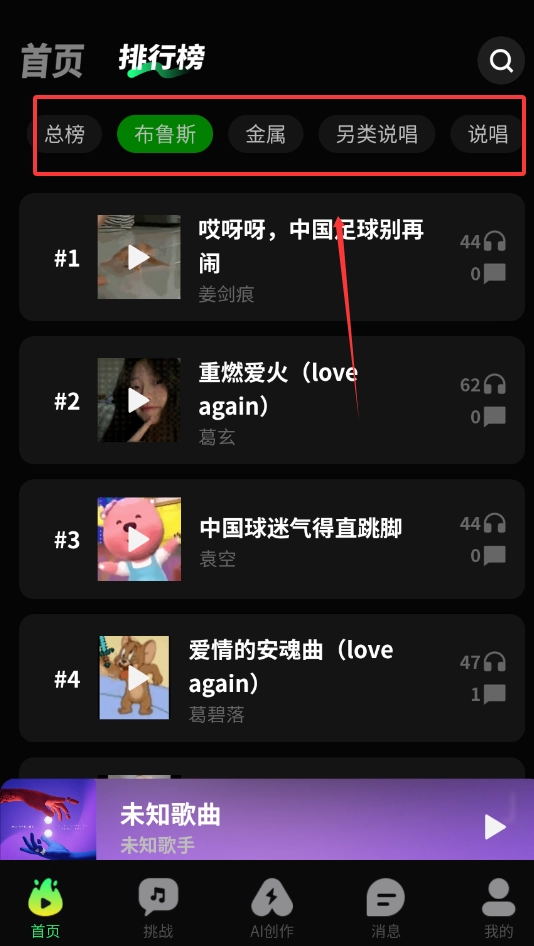 进入排行榜后,在选项里挑选你喜爱的歌曲类别,接着向下翻阅,就能开始收听了。