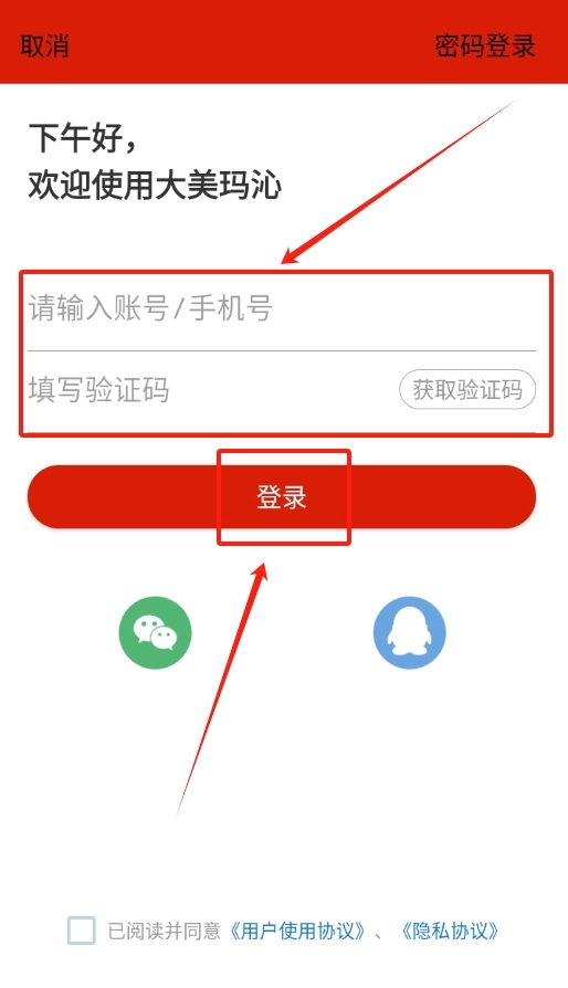 跳转至登录页面后,在指定位置准确输入个人手机号,点击获取验证码,把收到的验证码填入对应输入框,最后点击登录按钮。