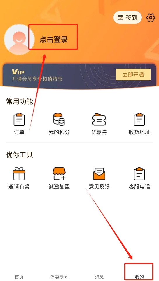 打开软件后先别急着点餐,得先找到右下角的“我的”页面登录账号,这样才能使用全部功能。