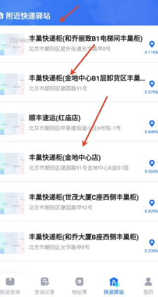 整合周边快递驿站的相关信息,呈现圆通、顺丰、中通、韵达等品牌驿站的具体位置,便于用户依据自身情况就近挑选取件或寄件的场所。