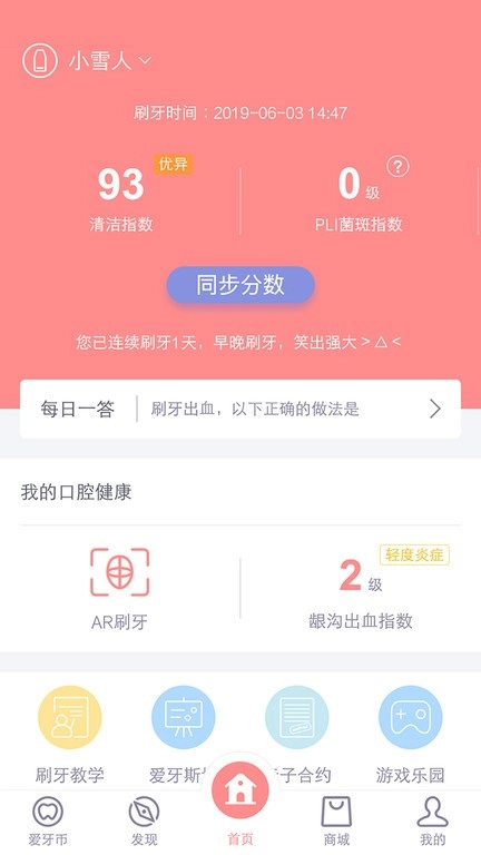 4、进入小雪人部分,查看您的详细清洁指标,了解您的刷牙报告的内容,并快速重新刷。