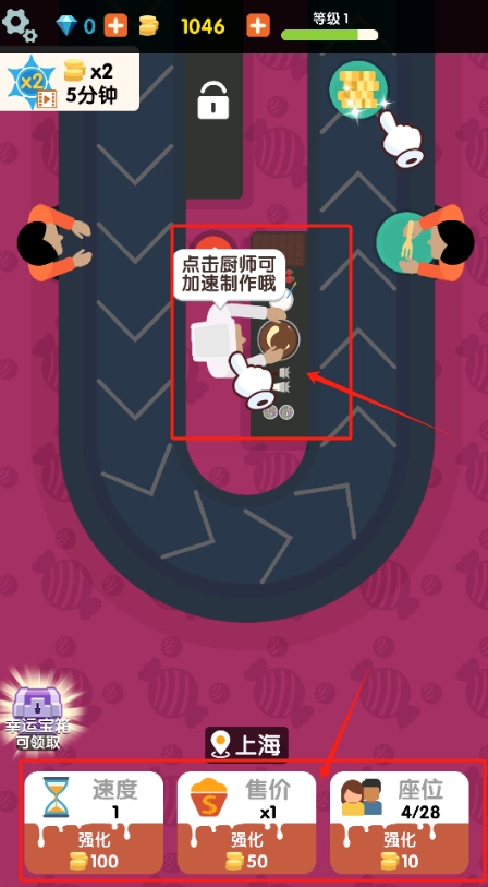 点击厨师可以加快做菜速度,等攒够100金币后,建议先升级做菜速度,另外座位目前还能容纳4个人。