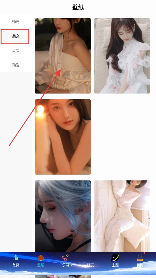 挑选你喜欢的美女壁纸,点击缩略图进入预览页面,点击【】就能保存到手机里。