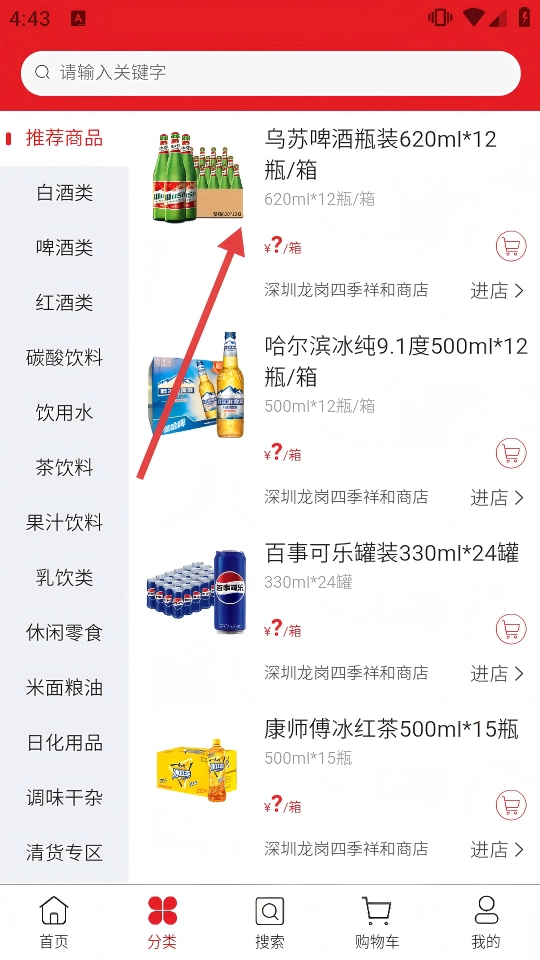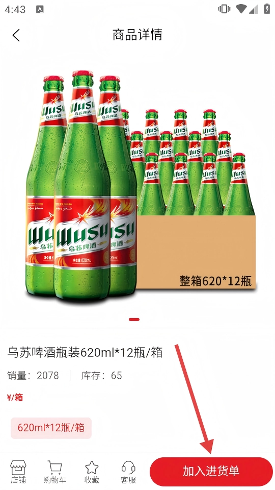 在分类页面的左侧区域找到并选择【啤酒类】分类,接着点击【乌苏啤酒瓶装】对应的商品卡片,即可进入该商品的详情页面。
