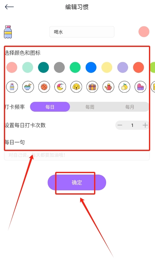 选好习惯后,挑选一个你喜欢的图标颜色和打卡频率,最后点击“确定”按钮,这样就设置完成了。