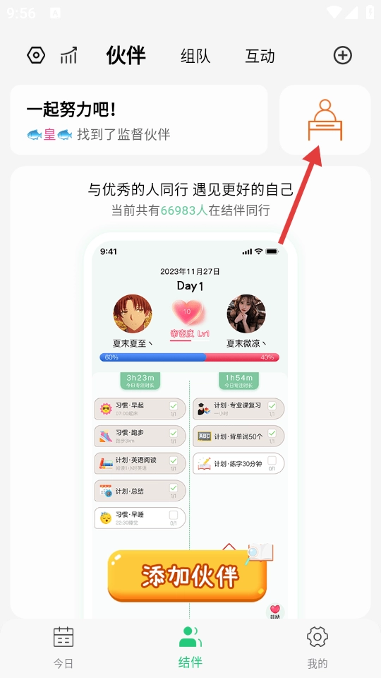 打开应用后,切换至结伴页面,点击该页面右上角的自习图标,系统随即弹出自习楼的选项列表。