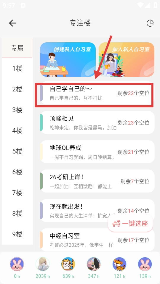 在专注楼页面,依据自身需求挑选自习室,随后点击进入该自习室的页面。