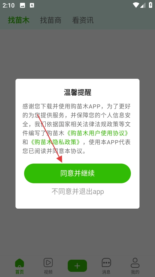 在购买苗木的【温馨提醒】弹窗里,点击【同意并继续】按钮,即可进入软件的主界面。