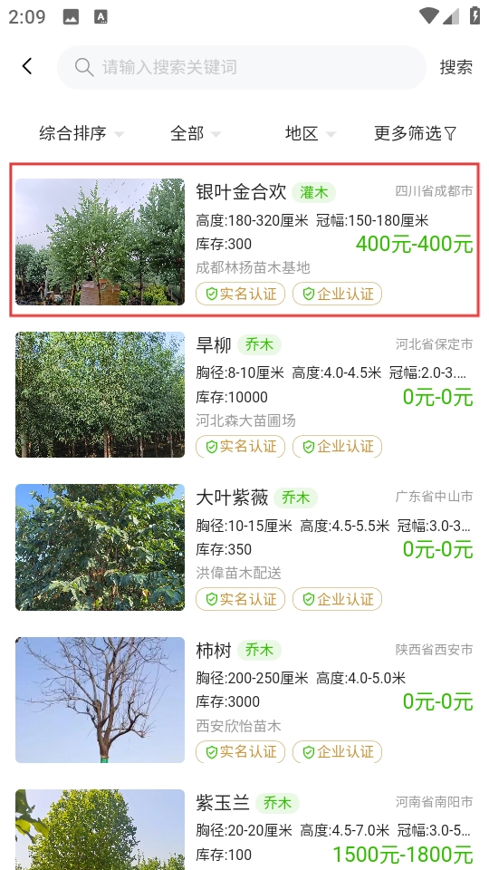 在苗木供应清单里,挑选【银叶金合欢】这一苗木品种,接着进入它的详情页面。