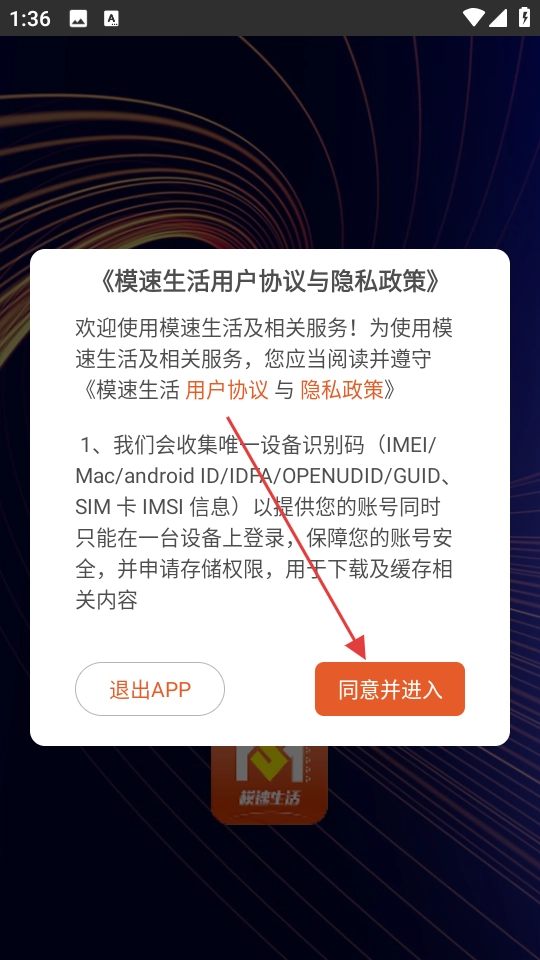 当弹出《模速生活用户协议与隐私政策》窗口时,点击【同意并进入】按钮,即可进入软件的主界面。