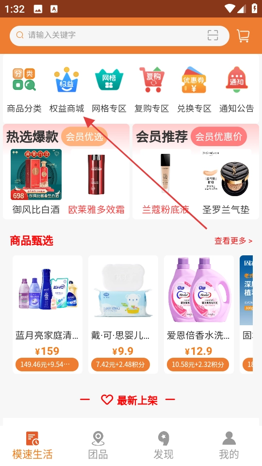 在软件的首页找到【权益商城】并点击,就能进入权益商品的列表页面。