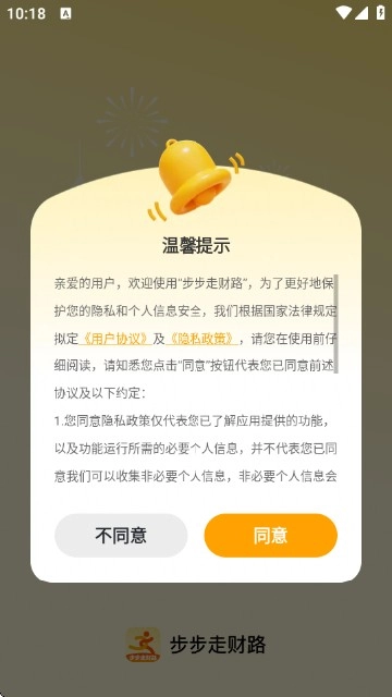 1:打开步步走财路应用,仔细阅读温馨提示内容后,点击橙色的“同意”按钮,即可进入应用主界面