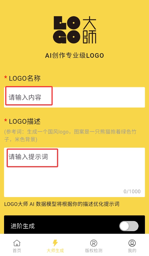 在输入框填写品牌名称,再用关键词描述期望的风格(比如科技感、极简风或卡通风),系统就会自动生成对应的设计方案。