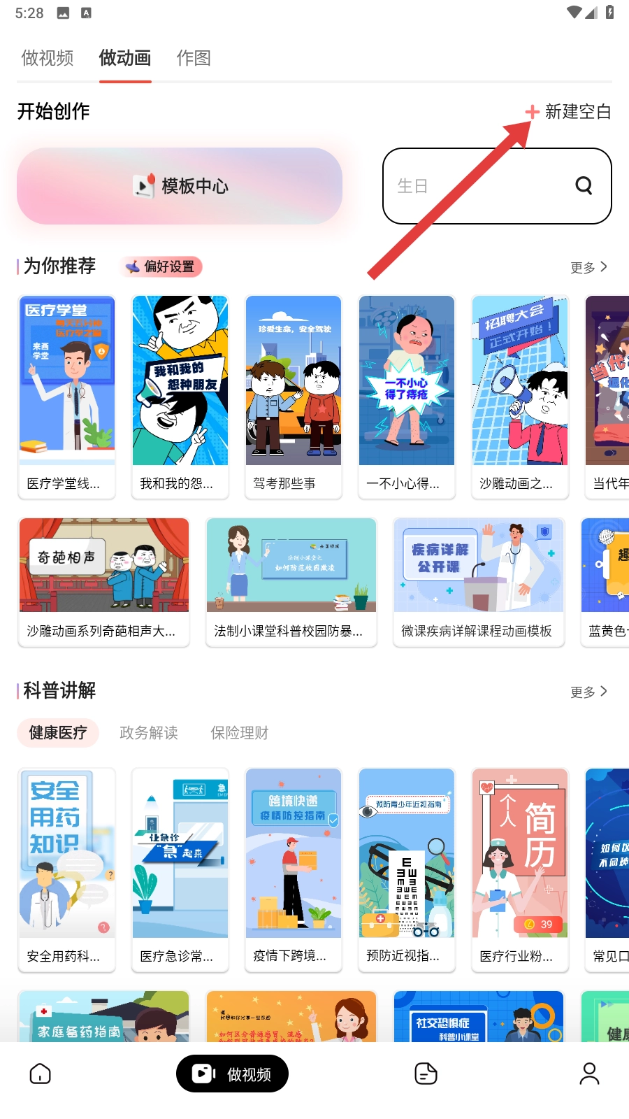 打开来画后,进入【做动画】页面并点击【新建空白】,即可开启你的动画视频创作之旅。