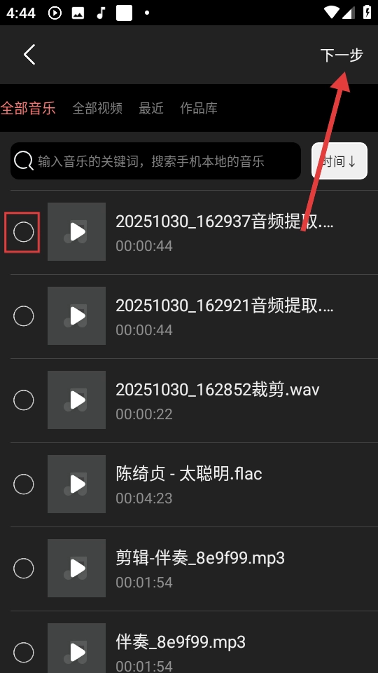 你可以这样修改: 从音频列表里挑选出你需要的音频,然后点击右上角的【下一步】按钮,继续进行后续的操作。