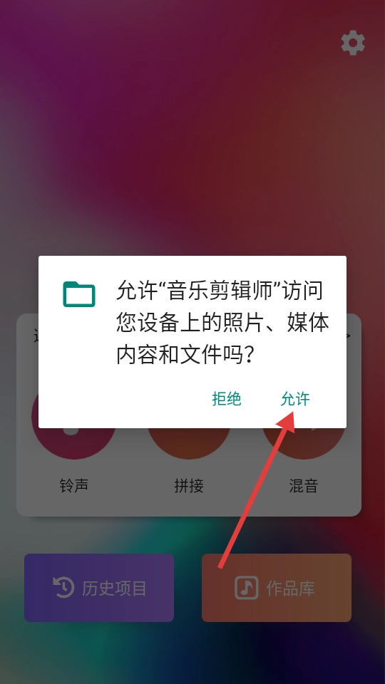 第一次使用音乐剪辑师这款应用时,请点击【允许】按钮,授权它访问您设备里的照片、媒体内容以及文件,这样才能保证应用可以正常运行。