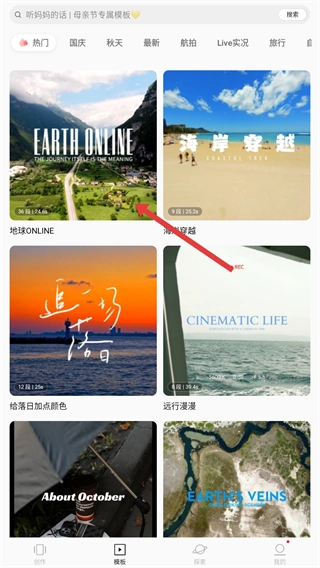 打开畅片应用,进入模板页面后挑选自己喜欢的模板,像【地球ONLINE】这类就很不错,接着点击进入视频编辑界面即可。