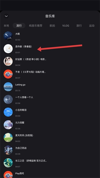在音乐库的流行分类中挑选心仪的曲目,像《恶作剧》这类,就能顺利添加到视频里,让视频拥有悦耳的背景音乐。
