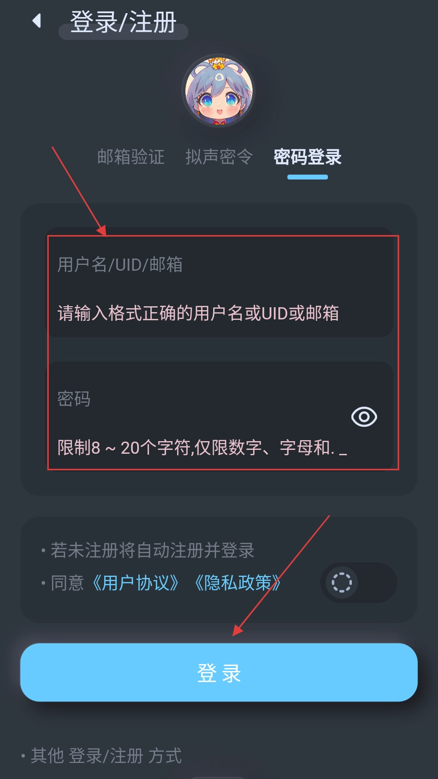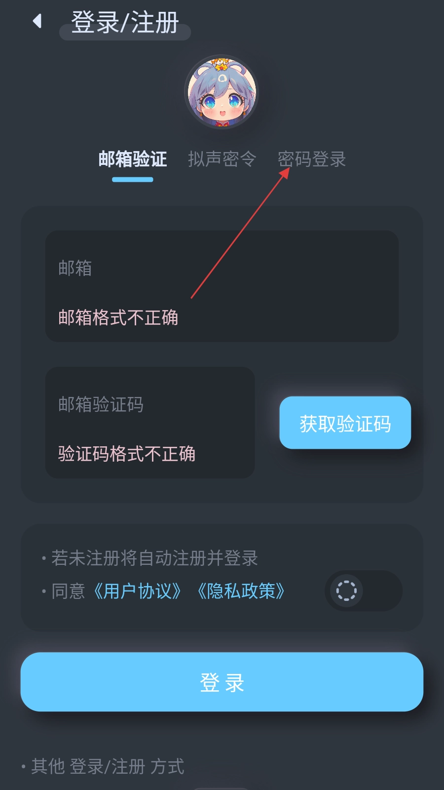 在登录或注册页面,点击【密码登录】按钮,即可切换至密码登录的界面。
