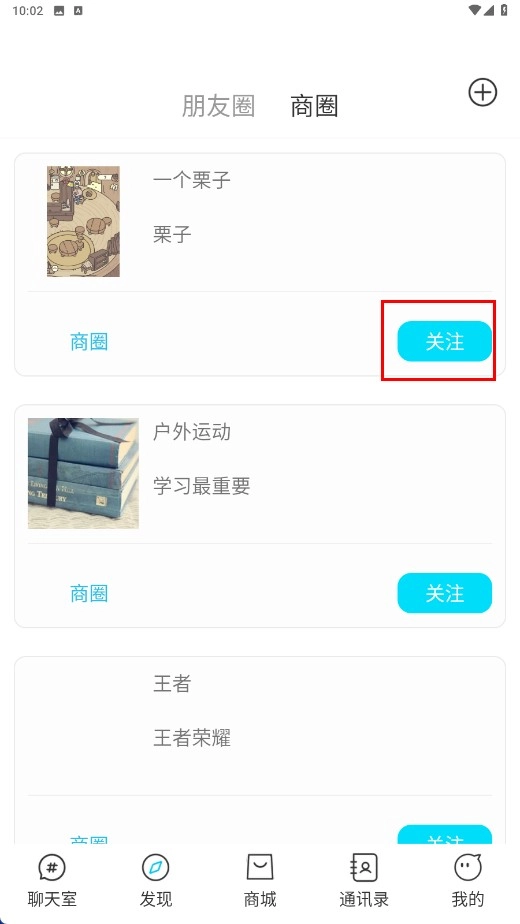 在商圈页面找到你感兴趣的商圈条目,点击【关注】功能按钮。