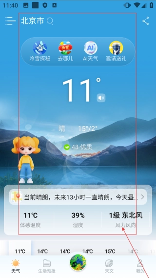 进入天气界面后,能够【查看北京市的实时天气信息,涵盖温度、天气状况、体感温度】等内容,体验天气查询及特色服务。
