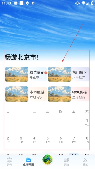 进入生活预报界面后,你可以【查看畅游北京市的相关服务,像精选赏花、热门景区】等内容,从而获取生活游玩方面的资讯。