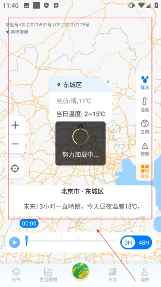 进入地图界面后,你可以【查看北京市东城区的天气地图,了解降水、温度】等分布情况,从而掌握该区域的天气动态。