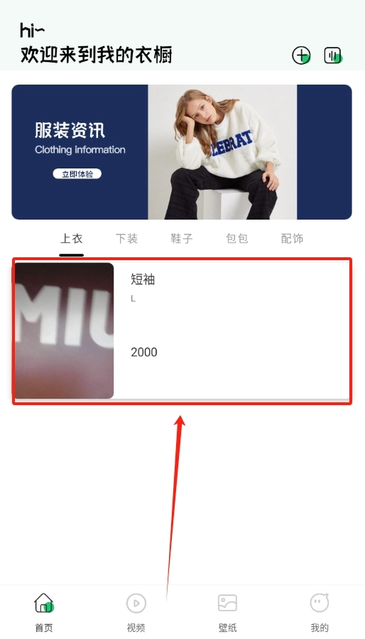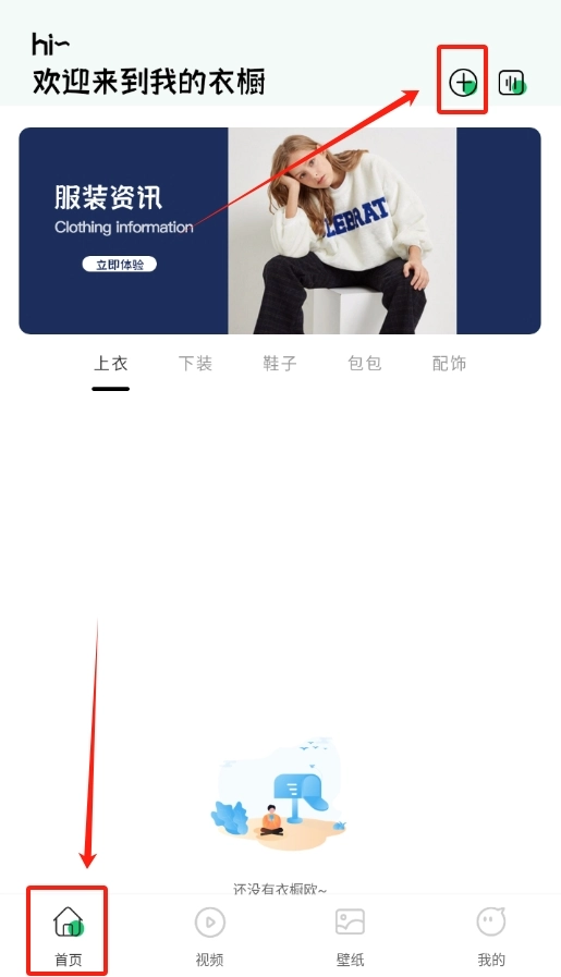 软件成功启动后,在首页找到衣物属性分类的板块,选定上装、下装这类具体类别,之后点击页面右上角的加号按钮。