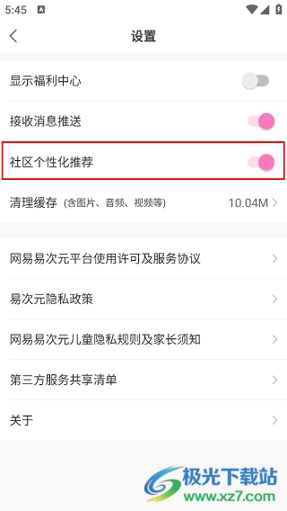 接着就会进入“设置”界面,这里提供了丰富的设置选项,接着在列表里找到“社区个性化推荐”这一选项,最后点击它右侧的开关按钮将其关闭即可。