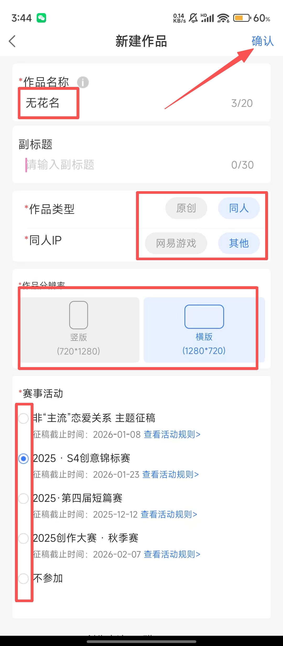 在新建作品的页面中,填写好【作品名称】、选好类型等相关信息,接着点击【确认】按钮,就可以进入到下一步操作了。