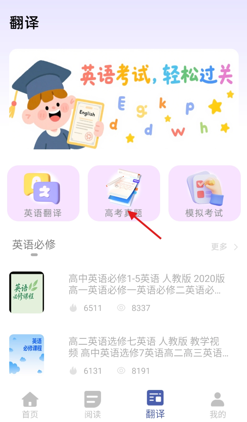 进入翻译页面后,在琳琅满目的功能模块里,找到“高考真题”板块并点击它。