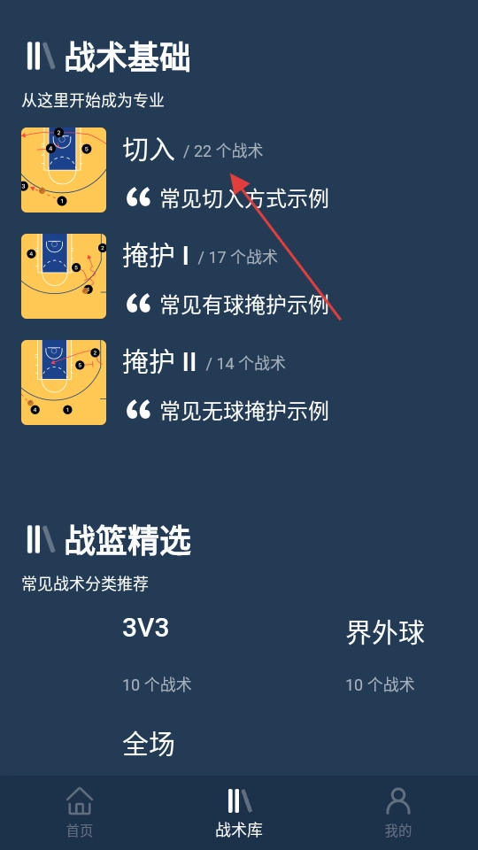 在战术库页面里,点击【切入】这个战术分类,就能进入切入战术的列表页面。