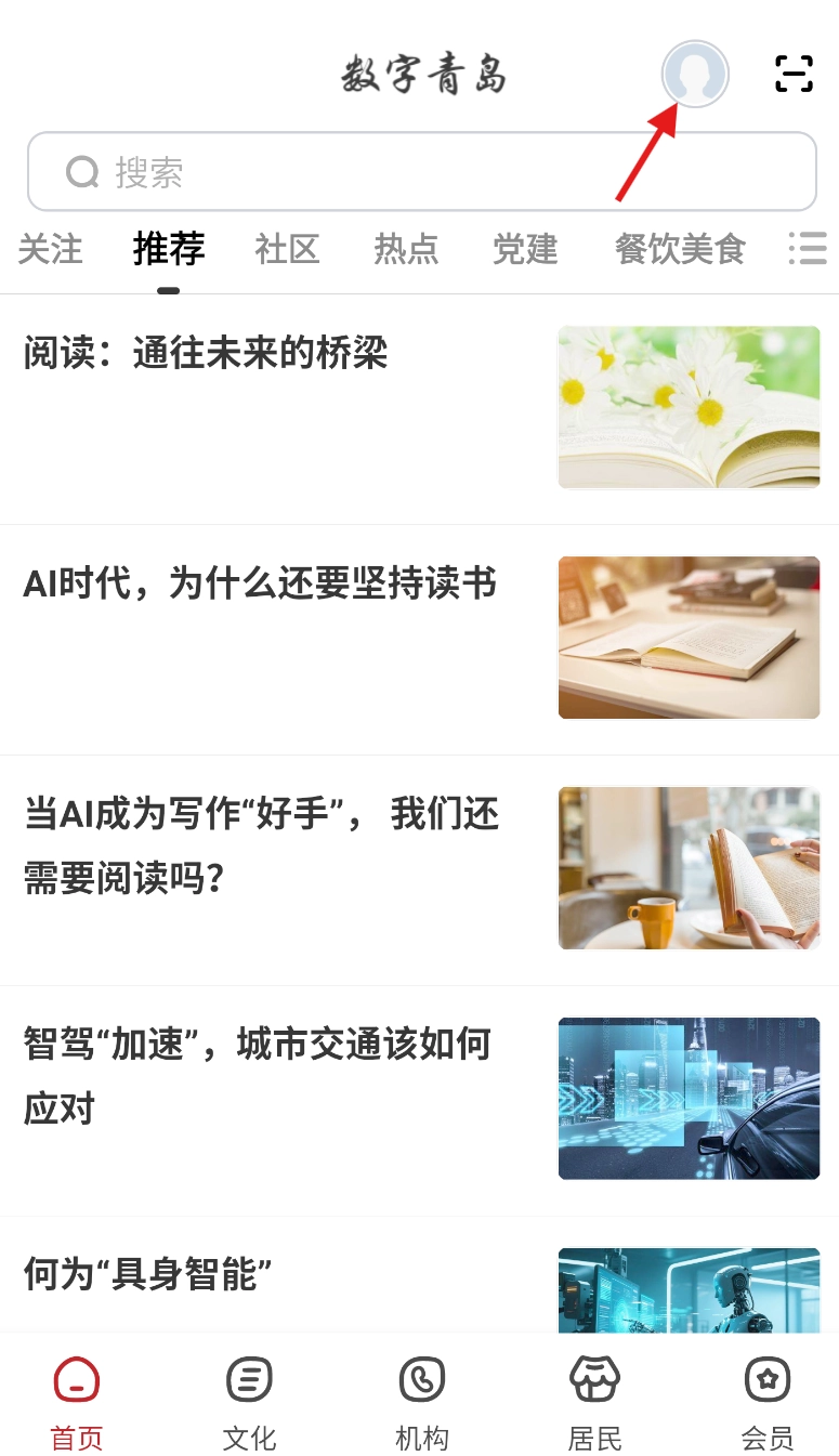 打开数字青岛并进入首页后,轻点界面右上方的头像标识,即可进入个人相关页面。