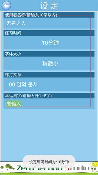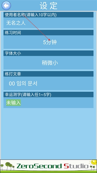 进入【设置】界面后,能够对【使用者名称-请输入10字以内】进行编辑,目前【练习时长】默认设置为【5分钟】,同时也可以调整其他各项参数。