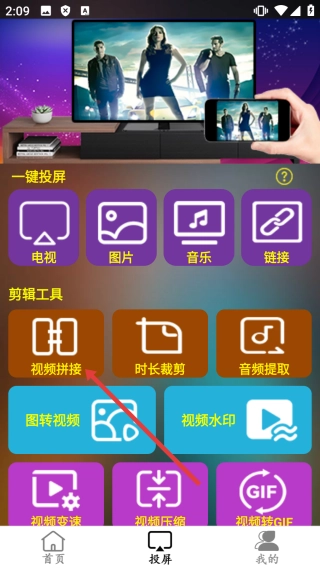 在投屏界面中,找到并点击【视频拼接】按钮,即可进入视频选择界面。