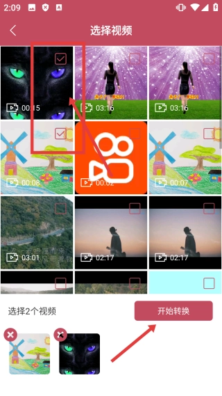 在视频选择界面选定目标视频后,点击“开始转换”按钮,即可执行视频拼接操作。